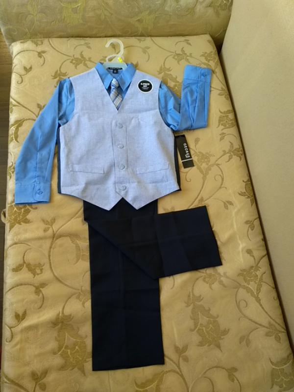 Рубашка - хлопок, полиэстер, длина рукава 42 см, штаны на резинке - полиэстер, длина штанин с поясом 80 см, жилет - полиэстер, галстук на удобной застежке, ребенок сможет сама застегивать Внимание - кружочек на жилетке - это просто бумажная этикетка