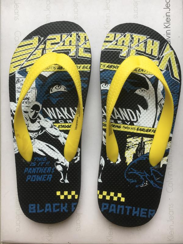 Шлепанцы Marvel Black Panther, размер 32/ стелька 21 на стопу 20.5 Состояние: Не носились, без дефектов и нюансов, бумажного ярлыка нет. Форма пальца ноги: Круглый носок Покажите свою любовь к «Черной пантере» Marvel с помощью этих стильных шлепанцев. Эти вьетнамки имеют черно-желтый дизайн с изображением культового персонажа Черной Пантеры. Обувь идеально подходит для путешествий, повседневных прогулок или любого пляжного отдыха. Эти шлёпанцы легкие и удобные в носке. Они имеют стандартную ширину обуви. Купите прямо сейчас и продемонстрируйте свою любовь к Черной Пантере!