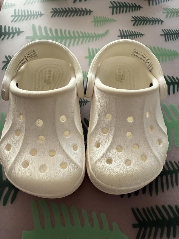 Розмір 21, устілка 11,5см. Стан дуже хороший, не заношені, проте є жовтизна на передках і швах, її зовсім не видно, показала на фото. Малюкам сподобається відчувати себе комфортно і впевнено за допомогою сабо для дівчаток Crocs Baya Clog T. Стильна версія вирізняється більш витонченими лініями, легкою і міцною конструкцією, яку люблять діти, з поліпшеною вентиляцією, яка забезпечує повітропроникність і допомагає відводити воду і сміття. Особливості: Поворотні п'яткові ремені для більш надійної фіксації. Підошва з піноматеріалу Croslite для кращого зчеплення, підтримки та комфорту. Отвори для підвісок Jibbitz. Iconic Crocs Comfort: легкі, гнучкі, комфорт на 360 градусів. Рекомендації щодо догляду: Після кожного носіння просушувати взуття, уникаючи нагрівання. Рекомендується хімчистка, якщо виробник не вказав інший спосіб чищення на виробі або упаковці. Уникати сильного намокання під час носіння. Зберігати взуття, використовуючи спеціальні вставки або папір для підтримки форми.