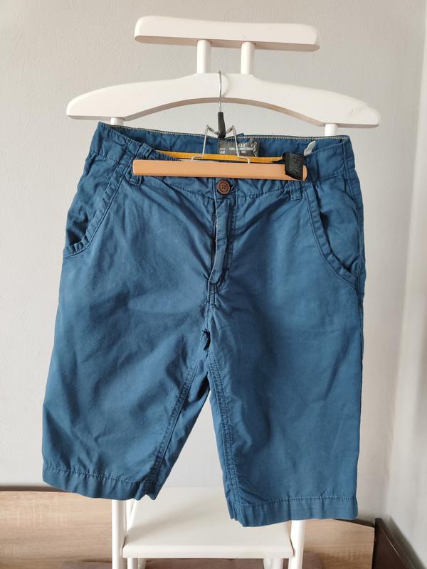 Шорты коттоновые H&M Стан - идеальный Размер 164 см, 13-14 лет Производство Бангладеш Цвет - синий - два кармана спереди и два сзади; - пояс застегивается на пуговицу, есть петли для ремня (ширина петель – 5 см) Замеры: Длина 56 см, пояс 35 см, бедра 47 см, ширина внизу 20 см Также в наличии есть другие шорты разных фирм