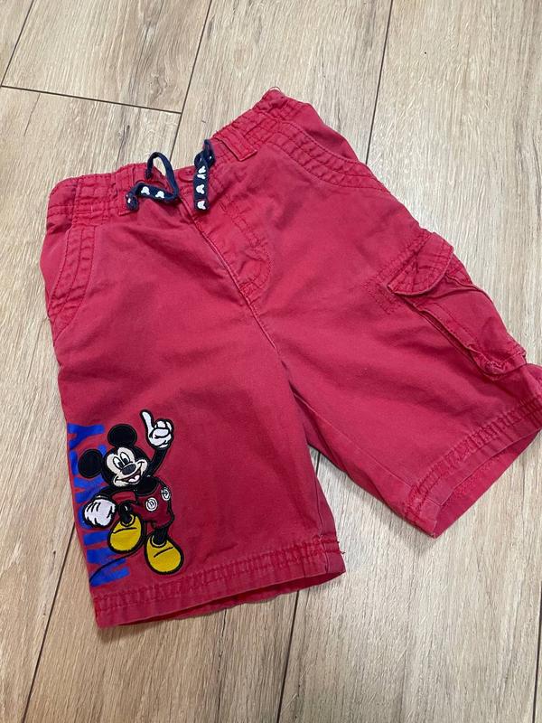 Минимальный заказ у продавца на 100 грн. Хорошенькие шорты Disney красного цвета на ребенка 3-4 года в хорошем состоянии. Полуобхват по поясу регулируется внутренней резинкой на пуговичке, максимально 31 см, длина по внутреннему шву штанины 13 см, длина по внешнему шву штанины 33 см, высота посадки 21 см. Ткань хлопок, не тянется. Модель 3084