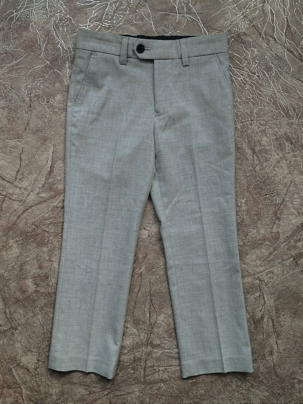 Тип одежды : Брюки На рост 116см. Замеры: полуобхват пояса 29см (регулируется резинкой), полуобхват бедер 33см, длина по наружной части 65см, ширина штанины в нижней части 15см, расстояние от пахового шва к низу (шаговая длина) 46см, расстояние спереди от пояса до пахового шва (посадка) 20см. Материал: 66% полиэстер, 32% вискоза, 2% эластан. Цвет: серый. Made in Vietnam. Состояние отличное.