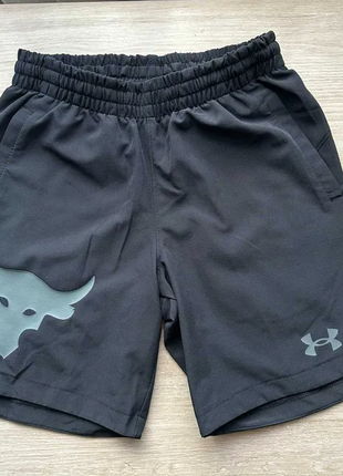 Дитячі чорні шорти UA Project Rock Woven Shorts Пояс на еластичній резинці та шнурівці Легенькі, на літо ідеальний варіант Кармани з сіточки Розмір: YSM/ JP/ CH На об'єм талії 58,4-70см, 8 років, зріст 128-134см