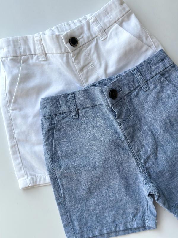 Цена за одни шорты!!!!!!! Новинка среди коттоновых шорт от Next 🧵 Две такие разные, очень красивые и качественные модели шорт🔝 1️<unk> Перша модель - цвет словно под джинс. Имеют два кармана спереди, застегиваются на пуговицу и имеют резинку внутри. Ткань очень легкая, даже немного просвечивается. 2️<unk> Друга модель - белоснежный цвет 🤍. Более плотная ткань, не очень просвечивает. Также имеют два кармана, и резиную резинку в поясе. Состав: 1️<unk> модель - 50% льна, 45% хлопка. 2️⃣модель - 100% бавовна Размеры в наличии : ✅12-18 месяцев (86 см) ✅1,5-2 года (92 см) ✅2-3 года (98 см) ✅3-4 года (104 см) Замеры ( обоих шорт ) : 📝12-18 месяцев : длина 25 см ; пояс 23 см. 📝1,5-2 года : длина 26 см ; пояс 24 см. 📝2-3 года : длина 27,5 см ; пояс 24 см. 📝3-4 года : длина 28 см ; пояс 25 см.