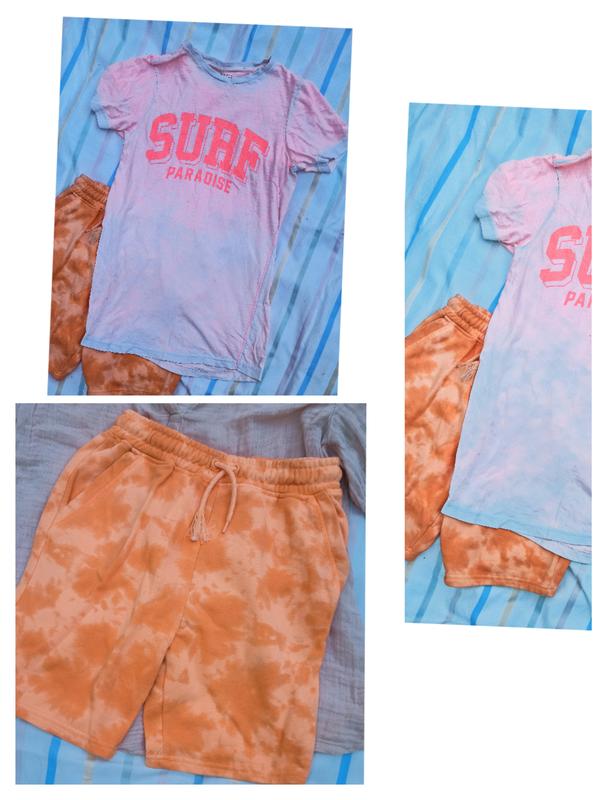 Отличные комфортные шорты(не жаркие) в идеальном состоянии, по бокам карманы. Тонкая коттоновая футболка с мраморным окрасом на этот же размер. Цена указана за одну единицу ,вместе 250. 240629