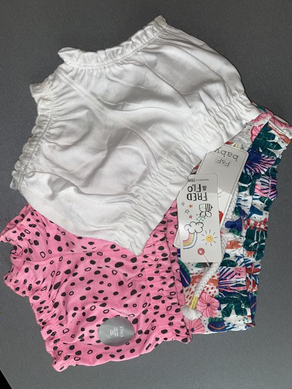 Детские шорты: 2 в наборе и 1 по отдельности. Новые. Очень красивые и удобные. Резинка не туга. Красивый принт и однотонные белые. Возраст: те, которые в наборе от 1-3 месяцев те, что отдельно 3-6 месяцев. Качество отличное.