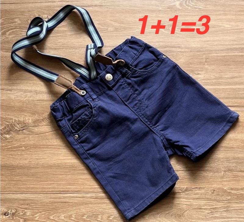 Купуєте 2 речі, а 3 річ в подарунок 🎁 🎁🎁 Нові модняві шорти з підтяжками темно синього кольору, талія регулюється з середини, в дуже гарному стані без дефектів. Розмір 92, заміри надам.