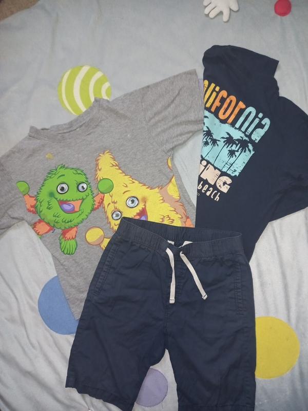 Набор из двух футболок и шорт Замеры ⤵️ Серая футболка : - длина 41 см - спина 34 см Шорти : - длина 38 см - полуобъем бедр 33 см - посадка 29 см Синяя футболка : - длина 41 см - спина 34 см