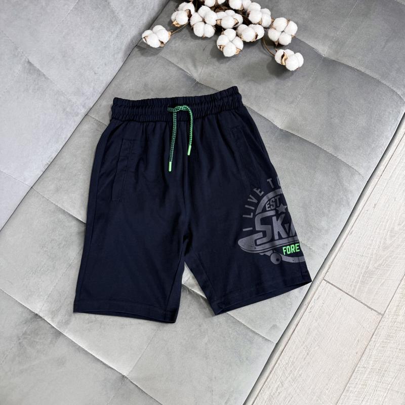 ❤️Шорти Skate , темно сині. З кишенями попереду та одна позаду. Тканина трикотаж 100% бавовна. Тягнеться. Малюнок - накат 📐Заміри: 134 - довж 41/пояс 27 140 - довж 42/пояс 28 146 - довж 43/пояс 29 152 - довж 44/пояс 30 158 - довж 46/пояс 31