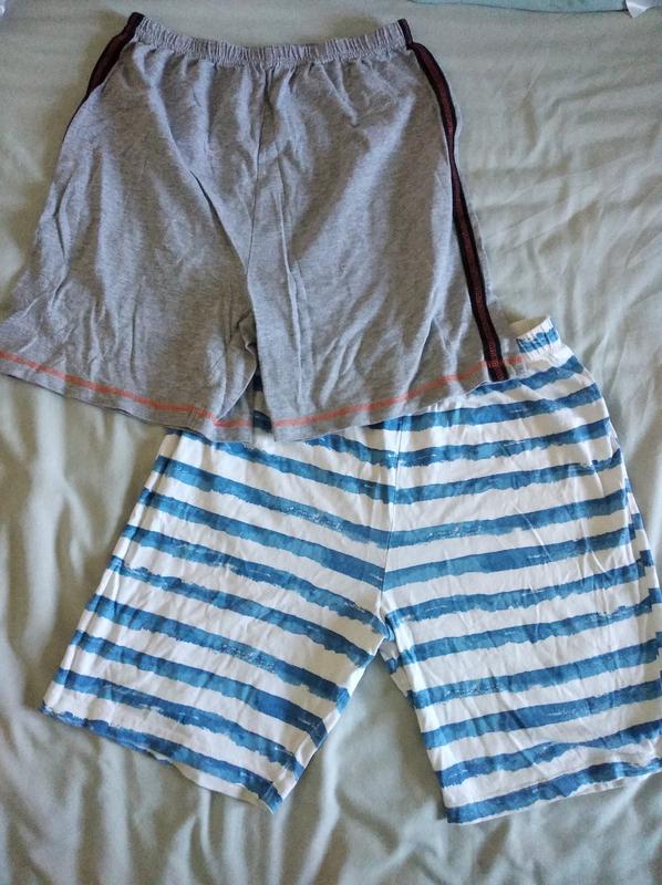 Две единицы шортов на мальчика хорошего качества коттоновые. Замеры голубо-белых шорт: длина 42, ПО талии 34, макс 40, посадка 29 Замеры серых шорт: длина 42, ПО талии 32, макс 44, посадка 31