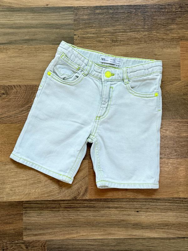 Джинсові шорти для дівчинки Zara, розмір 4-5 р, 110 Колір - як на фото. Стан - дуже гарний, єдиний нюанс - невеличка пляма. Видно, якщо дуже придивлятися. Фото дефекту зображено на останньому фото. Заміри: талія - 26 см стегна -31 см довжина - 30 см Склад - 100% бавовна
