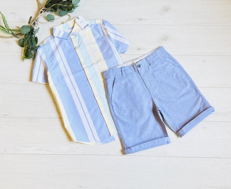 🌱Набір на10/11 р як новий Цена -350 г сорочка next д56 см ширина-42 см Шорти колір світліший , ніжно блакитний д-42 см пояс -34 см бедра -41 см