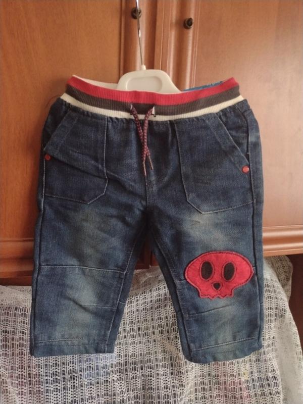 Это детские джинсовые шорты или бриджи синего цвета с характерной красной нашивкой в виде черепа на левой штанине. Особенности модели: Дизайн: изделие имеет эластичный пояс в красно-бело-синюю полоску со шнурком для регулировки объема и два накладных кармана спереди. Бренд: аналогичные модели встречаются в ассортименте брендов Kiki & Koko (часто продаются в сети Kik) или Pepco. Материал: Классический деним синего цвета с эффектом легкого освещения (потертости).