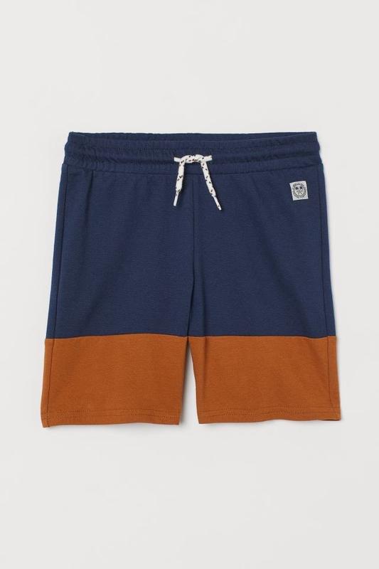 Стильні шортики H&M Відмінна якість за чудовою ціною! Шорти блочного кольору з легкого бавовняного світшота з еластичним поясом на шнурках. Склад: 100% хлопок. Колір: Темно-синій/коричневий. Розміри у наявності: 110. 110: ПОТ 28,2 ПОБ 34 Довжина по боковому шву 33,2 Посадка спереді 21 Посадка ззаді 28