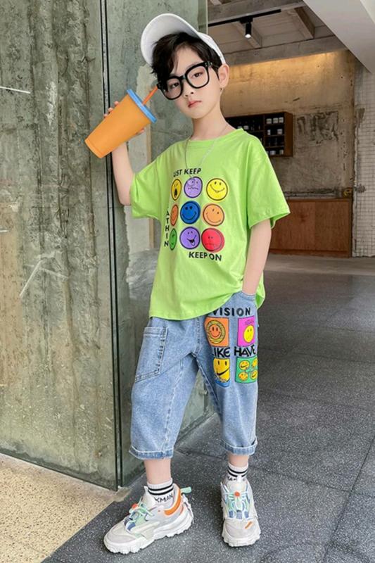 Подростковые комплекты салатовая футболка джинсовые шорты бриджи для мальчиков р. 130-160