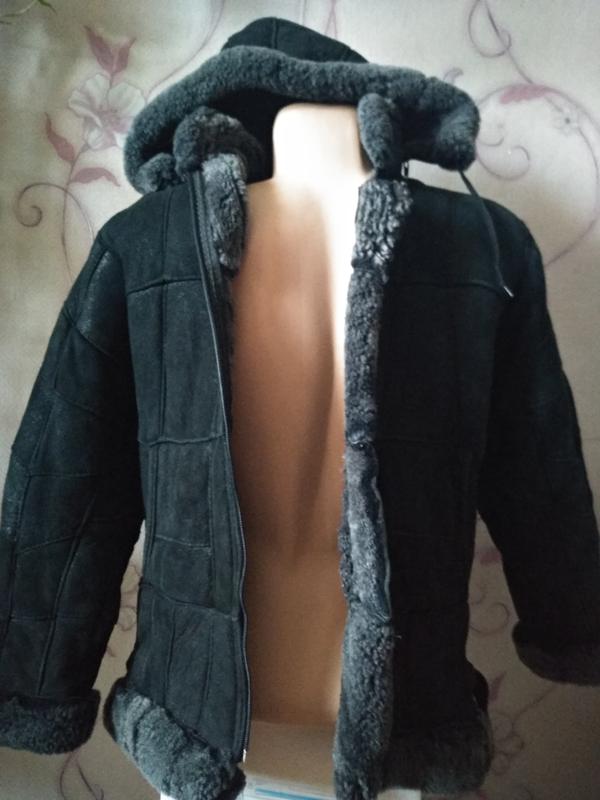 Черная натуральная очень теплая дубленка на змейке детская, молния, капюшон отстегивается, 2 кармана, по бокам ремешки ПОГ 46 Длина 63 Длина рукава с отворотом 49 см Ширина плеч 41 см