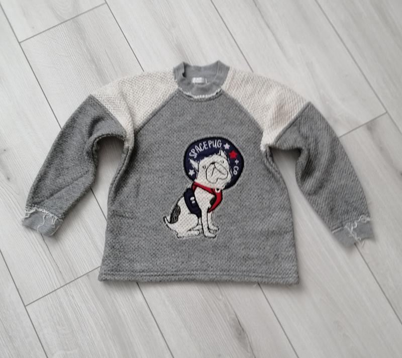 Оригинальный джемпер для мальчика. Выполнен из меланжевого фактрурного трикотажа. Спереди украшен апликацией. Особенностью модели является использование необработанных краев ткани у горловины и на рукавах. Горловина и рукава также обшиты эластичными трикотажными манжетами. Размер - 104. Замеры: длина - 42, ширина - 35, рукав от горловины - 43,5, рукав от подмышки. - 33.