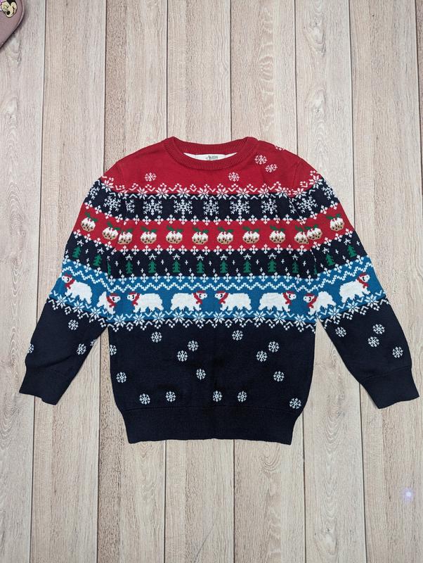 Новогодний свитерик 100% коттон. По наборке 4-5 лет. Длина 44, ширина 32, рукав 38.