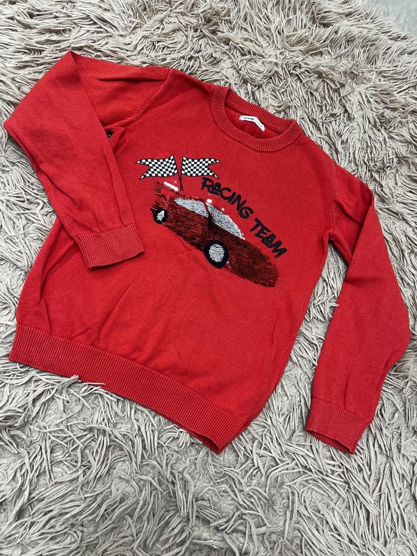 Светер на хлопчика з оздобленням машинки- перевертешуки. Розмір-134, заміри: довжина светра-47 см, ширина під руками-37 см, довжина рукавів-45 см