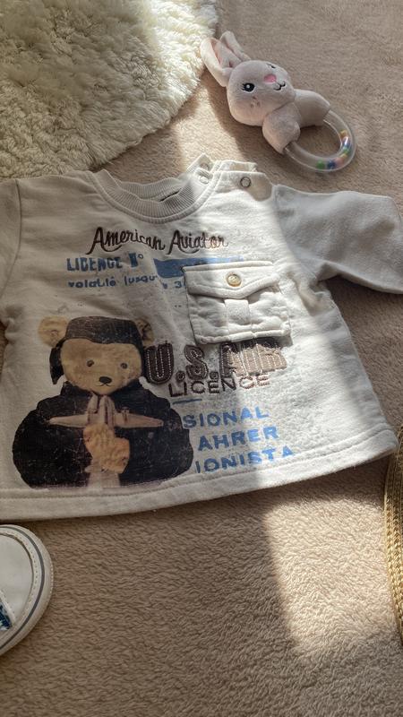 Светрик на малюка🤗 Детский свитер светло кремового цвета с длинными рукавами. На нем изображена медвежонок в стиле пилота, с очками на голове и в куртке. Рукава украшены небольшими пуговицами, которые можно расстегнуть для удобства. На груди есть маленький карман с клапаном, тоже на пуговице, что придает дополнительную практичность🤗 Этот свитер выглядит уютным и теплым, подходит для прохладной погоды