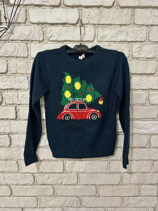 Красивый рождественский свитерик.Принт - ретромобиль с елкой.Яркий,кошлаток нет.Без дефектов Темно синий с автовкладышем на 135/140 см,дет на 7 лет