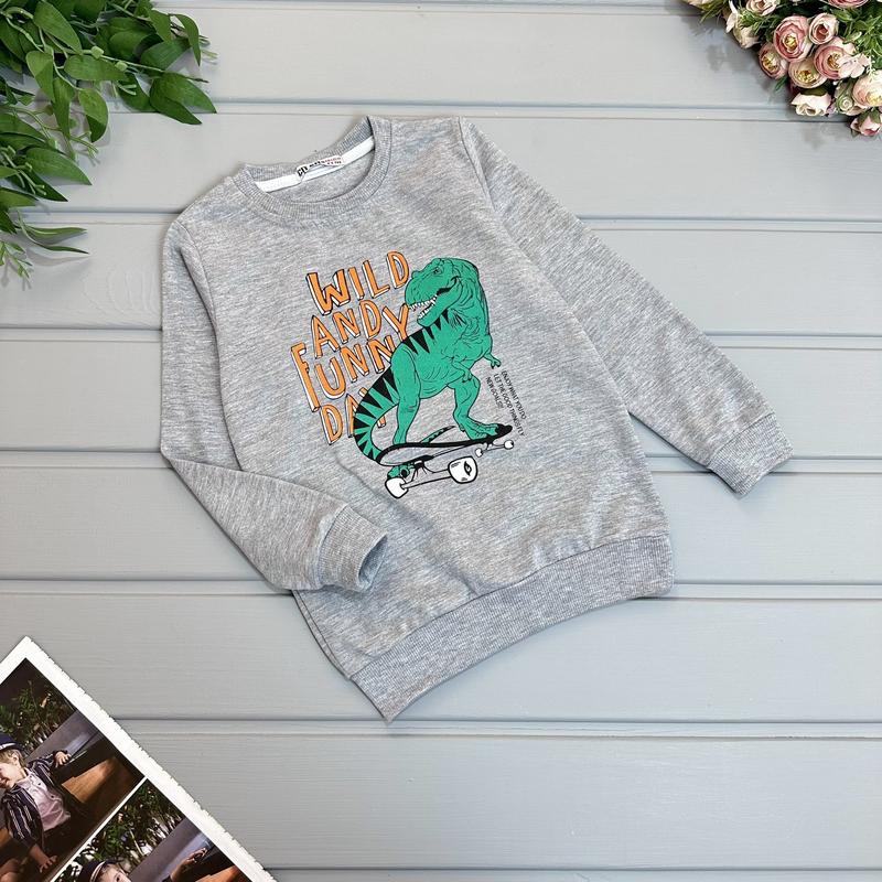 🦋Свитшот динозавр, серый. Тканина двунитка , малюнок - накат. Очень хорошее качество. Состав ткани 100% хлопок. Производитель Турция 📐Замеры: (104-110) - длин 44/ полуобхив. 31/рук. 38 (110-116) - длиж 45/ полуобхив. 31,5/рук. 41 (116-122) - длиж 47/ полуобхв. 33/рук. 42 (122-128) - длиж 49/ полуобхв. 35/рук. 44 💰Цена 295 грн