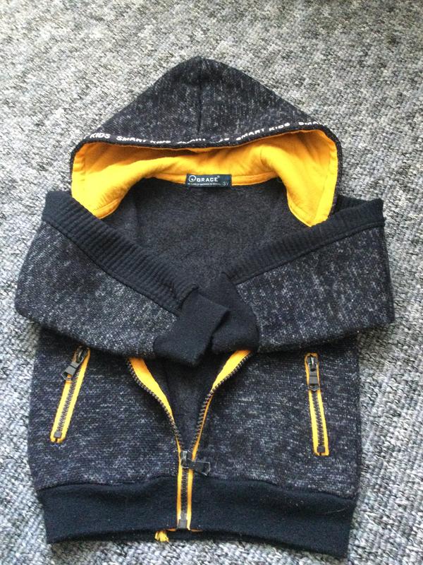 Тепленький свитшот на молнии.Удобный на ребенке стильно смотрится.Стан очень хорош.