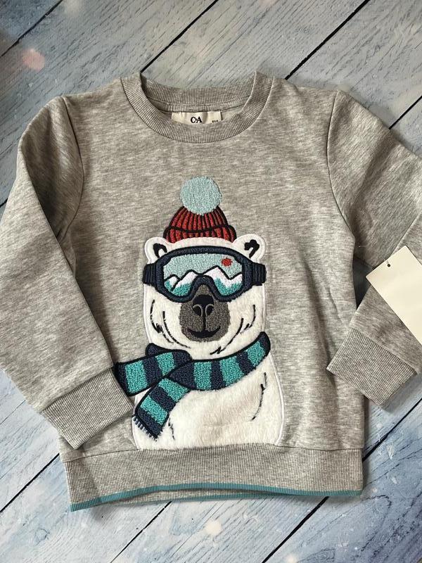 Симпатичний реглан для хлопчика від німецького бренда C&A Синій реглан оздоблений якісною вишивкою медведя в шапці . Відмінна якість , натуральна тканина , утеплені бавовняним начосом. В наявності на зріст 110 - 4/5 років . Довжина 42 см. Заміри : довжина 42см. , рукав від горловини 46см.