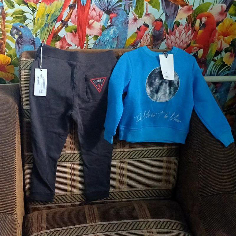 Штанишки бренда Guess (оригинал): - Длина от пояса до низа: 61 см - Внутренняя длина: 41 см - Ширина: 27 см - Состав: 100% хлопок Світшот Vika Adamskaya (kids) (оригінал): - Длина: 37 см - Ширина: 30 см - Длина руква: 34 см - Состав: 100% хлопок