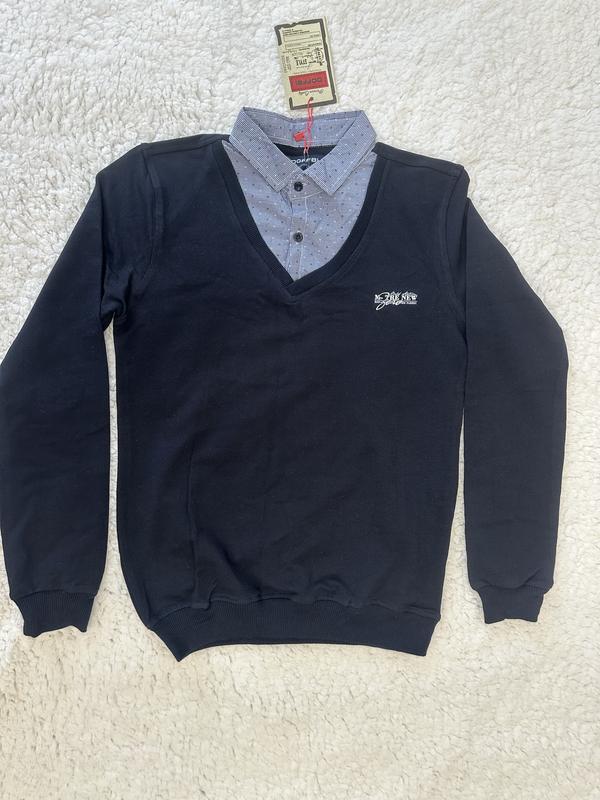 Новий світшот-обманка для хлопця, колір темно-синій, на бірці вказаний розмір 12 років, 152 см. Тканина 94% бавовна, 6% лайкра. Заміри: - напівобхват грудей 44 см - плечі 38-39 см - рукав 58 см - довжина 61 см