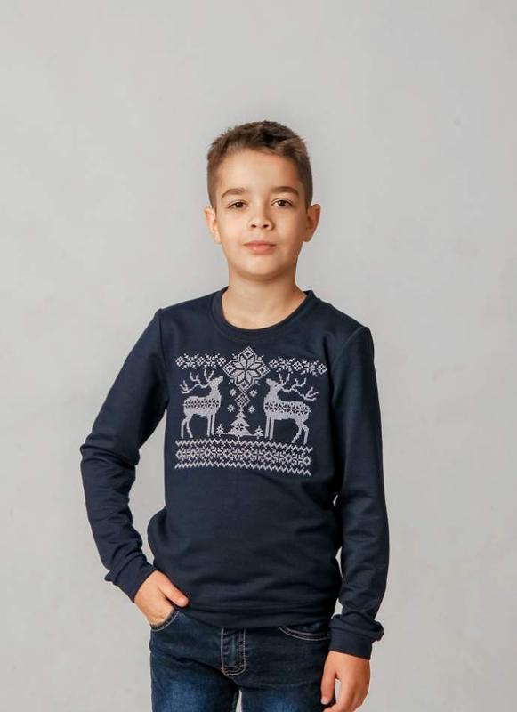 Свитшот темно-синий с вышитыми оленями. Трикотажне полотно двонитка, кругла горловина, рукава з манжетами. Указан размер производителя 152, по факту на 146. Длина рукава 55 см, длина по спинке 55 см.