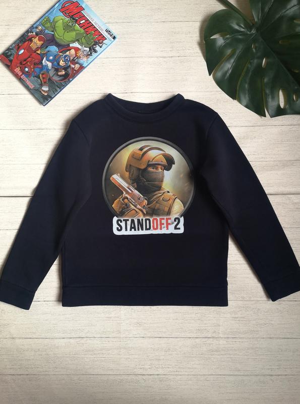 Классный свитшот на флисе для фанатов игры Standoff 2. Есть нюанс - маленькая зашитая дырочка на спине (видно на последних двух фото). При ношении этого совсем незаметно. Замеры : длина 52, ширина по груди 44, ширина по низу 41, рукав 48.
