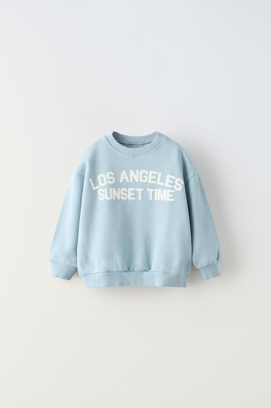 Світло-блакитний світшот Zara з написом "LOS ANGELES SUNSET TIME" на вік 5 років, бавовна. Ідеальний стан. Рукав від шиї 46см. Довжина по центру спини 44см, ширина під рукавами 43см.