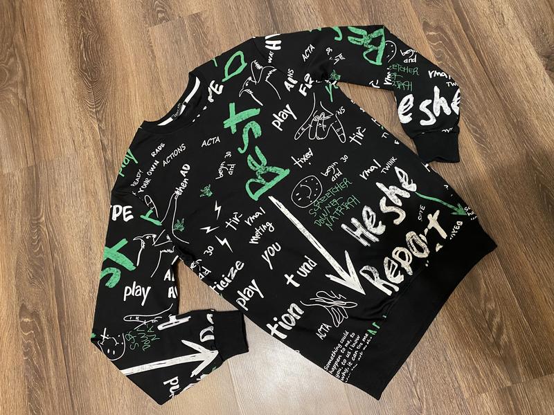 Класний світшот на підлітка у ідеальному стані, без утеплення, 95% Елтон і 5% лайкра Довжина 70 см Довжина рукава від плеча 62 см Під грудьми 50 см Ширина внизу 36 см, на резинці