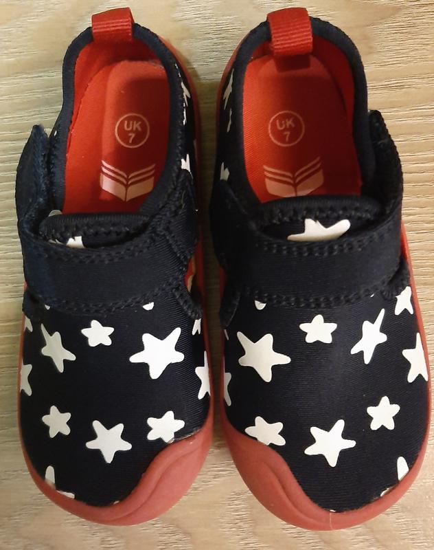 Капці . Могут быть удобными, как вторая обувь, так и в повседневной жизни.Синего цвета с принтом, белыми звездочками. Удобная застежка -липучка с резинкой, позволяет носку, независимо от полноты ножки. Стелька -14 см.
