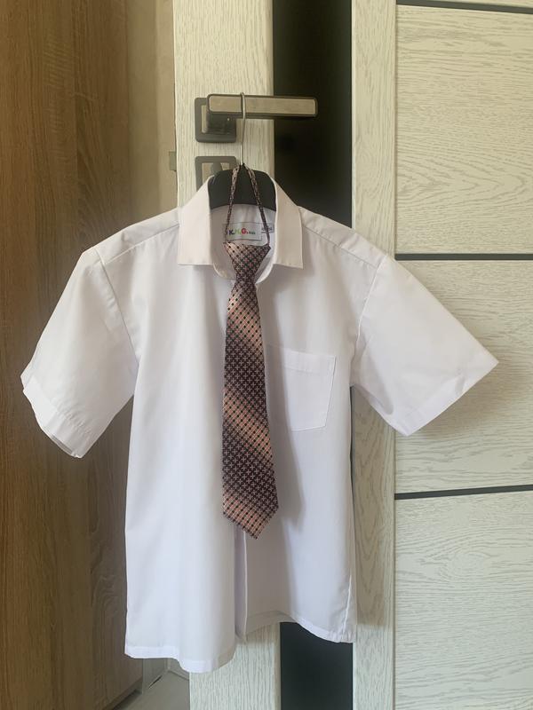Сорочка дитяча на хлопчика з короткими рукавами на зріст 128-134 см білого кольору. Краватка у подарунок