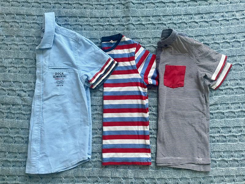 Три вещи в одной гамме цветов, по наборке 116-122, поскорее на 116 помимо рубашки, она немного больше. Футболка поло Next и рубашка LC Waikiki в очень хорошем состоянии, полосатая футболка Palomino в нормальном состоянии, без пятен и дырок. Ціна за комплект