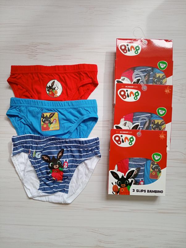 Трусики для хлопчиків з героями мультфільму кролик Бінг. Ціна вказана за одну упаковку. Розміри а наявності 3/4 роки (пояс 21 см, висота 16,5 см); 4/5 роки ( пояс 22 см, висота 17 см);