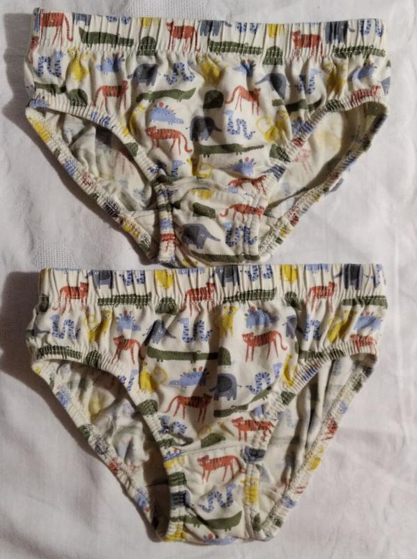 Без пятен. Вещь тщательно выстирана, но мог остаться запах секонда. На трусиках по одной маленькой дырочке (на фото видно) и на одних трусиках по низу растянута резинка (есть на фото).