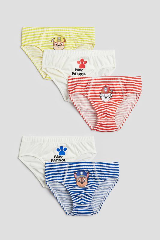 Упаковка из 5 пар трусов с принтом Paw Patrol H&M на 6-8 лет на р.122/128. Трусы для мальчиков из мягкого хлопкового трикотажа с принтом Paw Patrol, с эластичной талией и подкладкой спереди. Состав. 100% хлопок. В наличии - 3 шт. Цена за 1 шт.