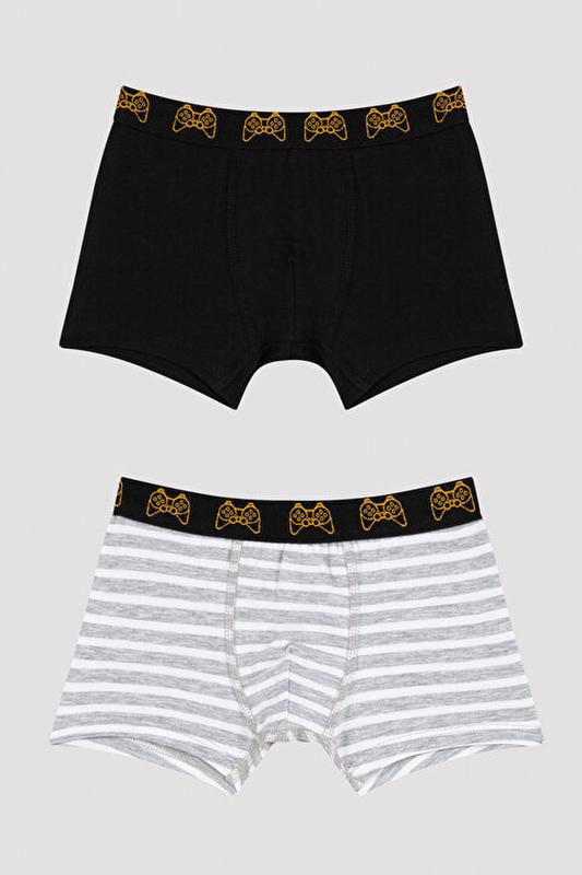 Набор из двух боксерских трусов для мальчиков в серо-белую полоску и черном цвете с принтом геймпада. 11-12 YAS/AGE: 11-12 ЛЕТ/ВОЗРАСТ