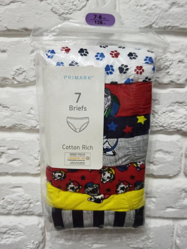 Комплект трусиков Primark на мальчика 7-8лет. Размер 128: ширина по поясу 23,5см, высота 20,5см. Состав ткани: 100%котон Страна-производитель: Бангладеш