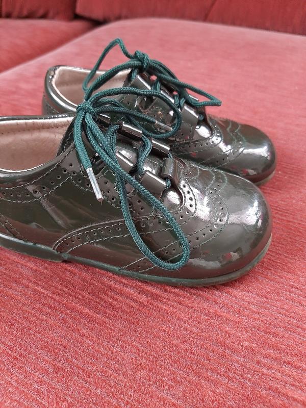 Туфлі гарного зеленого кольору. Шкіряні з супінатором. Стан дуже гарний. З недоліків тільки трішки поцарапані носики. Розмір 21, на ніжку 13,5 см