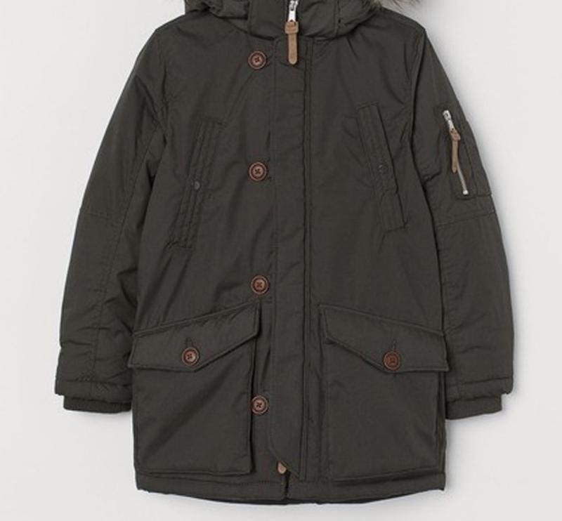 Парка зимова HM, на зріст 158-164. Заміри: довжина по спинці 84 см, довжина перед 78, довжина рукава від плеча 63(з манжетом 66), ширина під мишками 52 см, ширина плеч 43 см. Колір темно-зелений. Наповнювач холлофайбер. Дуже стильна і тепла. Парка в ідеальному стані