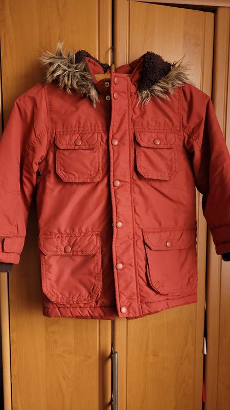 Стильная парка для мальчика терракотового цвета. В действительности цвет более спокойно. Почти в идеальном состоянии, только потертые кнопки. Еврозима. На 6-7 лет. Длина - 57см ПОГ - 41см Рукав - 41см, с манжетом 43см Плечи - 33.5см От капишона до конца рукава - 49см, до конца манжета- 51см