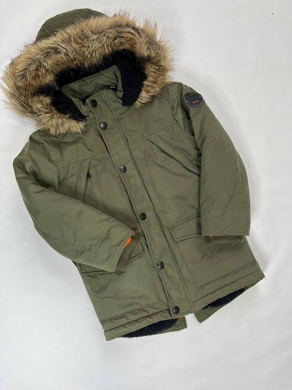 Зимняя парка для детей от blukids цвета хаки. Теплая, стильная и комфортная. Стан идеален. Мех на капюшоне не снимается. Размер 122 Замеры: Полуобхват груди 43см Длина рукава от плеча с манжетом 45см Длина впереди 52см, сзади 59см