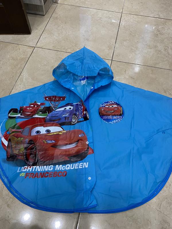 Очень классный дождевик по мотивам мультфильма Тачки..качество супер, надели пару раз, не промокает, на кнопках..приблизительно до 5-6 лет. Есть незначительный дефект, его возможно можно как-то вывести, к сожалению, нет времени, видно на последнем фото..в остальном идеал!