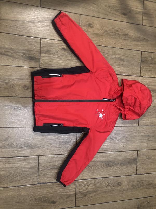 Яркая фирменная ветровка! Водо и ветро непроницаемая! Есть светоотражающие частицы! Указано на 4-6 лет! Длина 47 см ширина 37 см рукав 42 см!