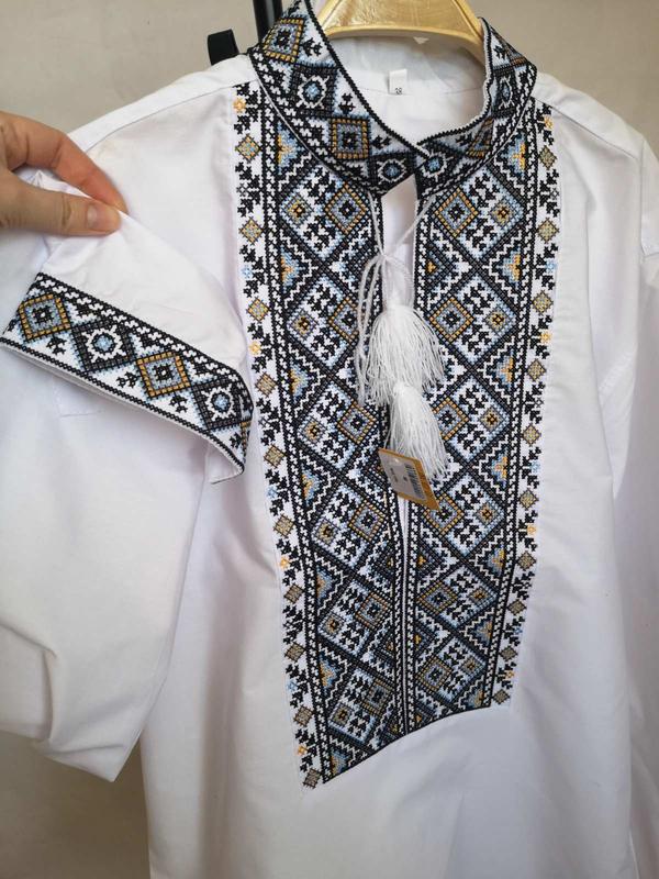 98- 116= 550 грн 122- 146= 650 грн 152- 170= 773 грн Новая вышиванка на мальчика. Машинная вышивка. Тканина - сорочкова (70% бавовна, 30% поліестер). Ткань не меняет форму после стирки. На манжеті - гудзик Колір тканини - білий Колір вишивки - чорний з жовто - голубыми вкрапленнями. Замеры делалися поверх рубашки, учитывайте припуск. По сравнению с замерами свободногл одежды, не по телу. Рубашка должна легко одеваться через голову, делайте поправку на то, что ткань не тянется. 152 розмір Ширина плечей - 36.5 см Довжина рукава від плеча - 55 см Ширина під руками - 46 см Довжина - 59 см 158 розмір Ширина плечей - 37 см Довжина рукава від плеча - 57 см Ширина під руками - 48 см Довжина - 60см 164 розмір Ширина плеч - 38 см Ширина під руками - 49 см Рукав від плеча - 59 см Довжина - 62 см 170 розмір Ширина плеч - 39 см Ширина під руками - 51 см Рукав від плеча - 61 см Довжина - 64 см