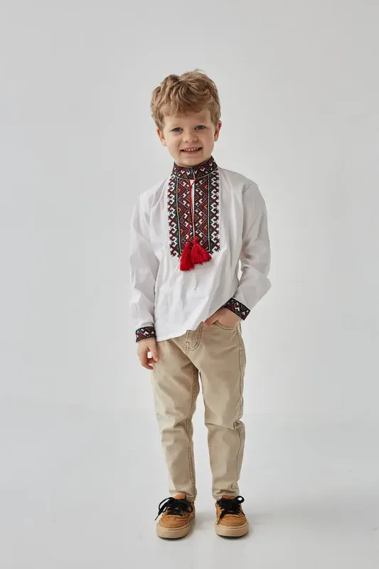 Рубашка с вышивкой "Мышко" наряд вашего ребенка в особенный день. Вышивка выполнена зелеными, желтыми, красными и черными нитями. Орнамент нанесен известной техникой крестиком на грудь и манжеты рубашки с длинным рукавом. Кисти красного цвета придают праздничность вышиванке. Размеры от 1 до 12 лет Тканина - бязь Состав ткани - 100% хлопок